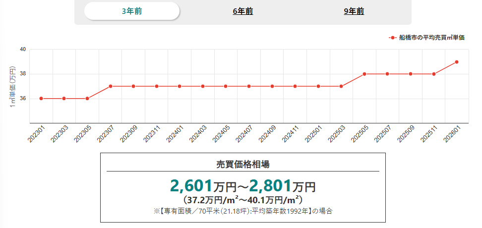 上記のグラフから、船橋市の売却価格は上昇傾向を示しており、資産価値が高まっていると言えるでしょう。マンションナビの市場データでは、1年前比+4.1%、3年前比+7.6%、6年前比+27.7%、9年前比+41.1%と、長期で見ても上向きの推移が示されています。